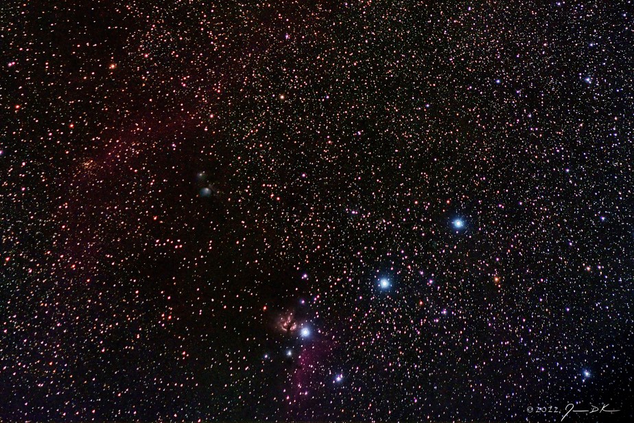 This is Orion’s Belt – the three bright blue stars are (l-r) Alnitak, Alnilam and Mintaka. The orange Flame and red Horsehead Nebulas surround Alnitak. The green “star” to the left is actually the Casper the Friendly Ghost Nebula (I don’t name these…) and was my original target tonight. It actually processed out better in other iterations, but I like this one overall. To the left of that is NGC 2112, an open star cluster, the orange blob in the red veil of cosmic plasma and dust smeared across the background…
