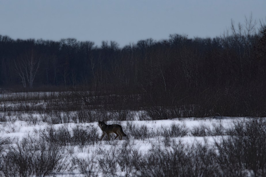 I didn’t see any owls, but on the way out, I caught what my/may not be a wolf, about 400 meters out. I imaged it on the outer limits of the 600mm, and enlarged it as much as possible without it breaking up into pixels. Part of me says “coyote”, but the other part says otherwise. Either way, it was cool to see it, wild and free in what passes for wilderness in Wisconsin.